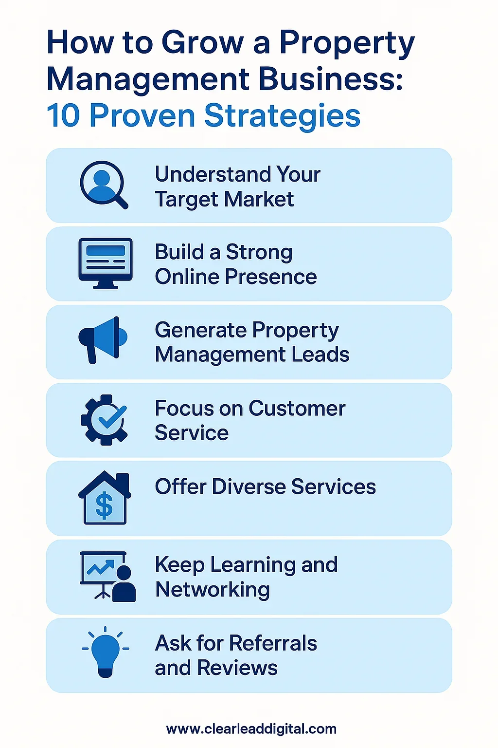 Below are 10 proven strategies to help you grow a property management business in today’s competitive market.