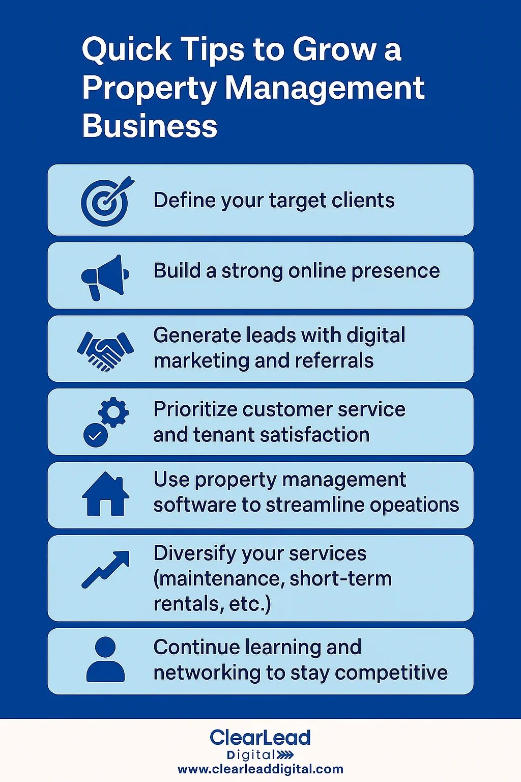 Growing a property management business doesn’t happen overnight. It’s about building strong systems, delivering great service, and staying visible to the right clients. Start small by focusing on one or two strategies, then expand as you gain traction.