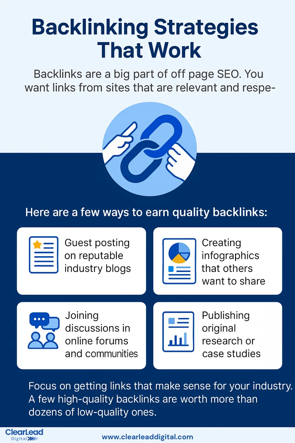 Focus on getting links that make sense for your industry. A few high-quality backlinks are worth more than dozens of low-quality ones.