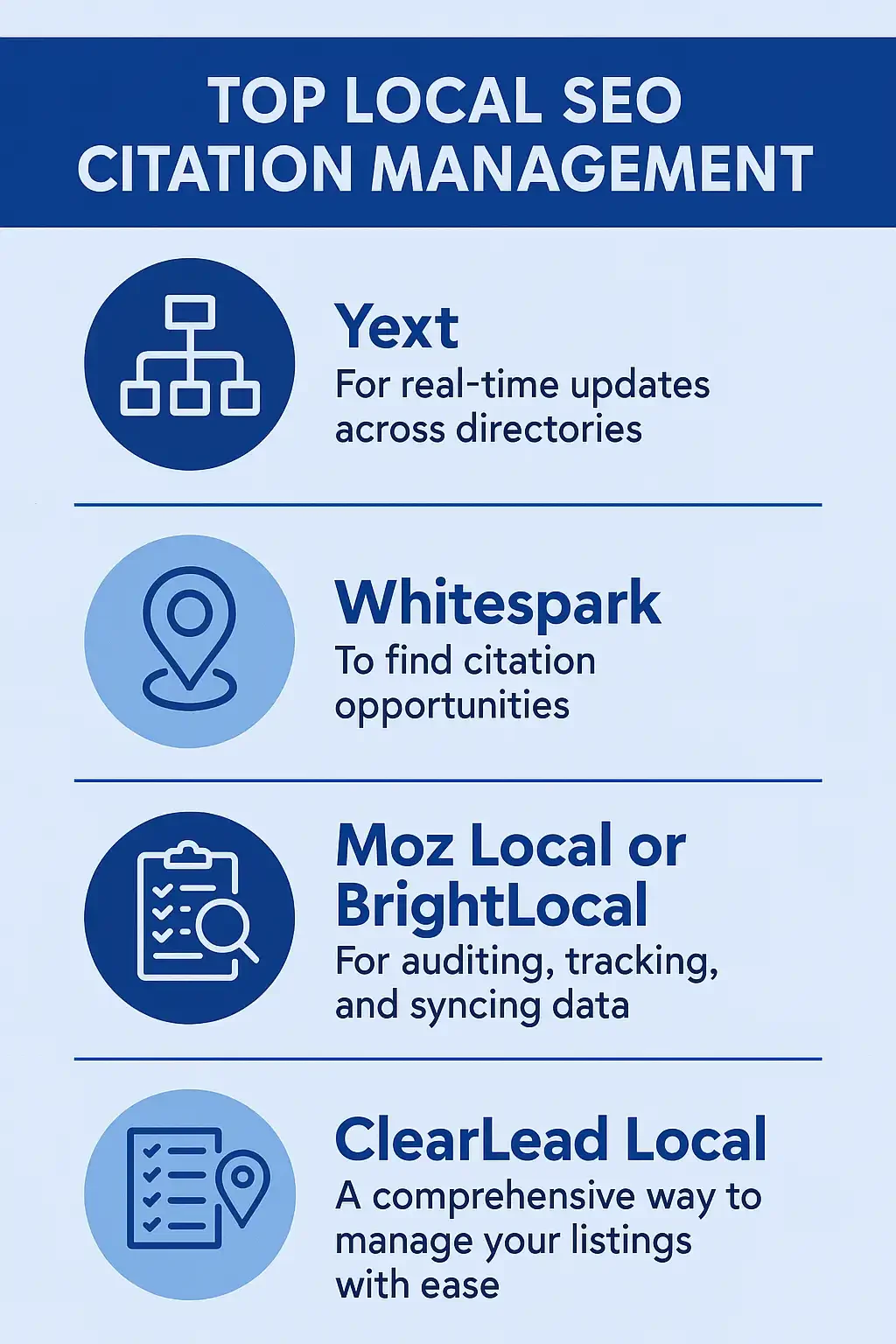 Use tools like ClearLead Local, Moz Local, BrightLocal, or Whitespark to discover all your business citations and identify outdated or duplicate entries.